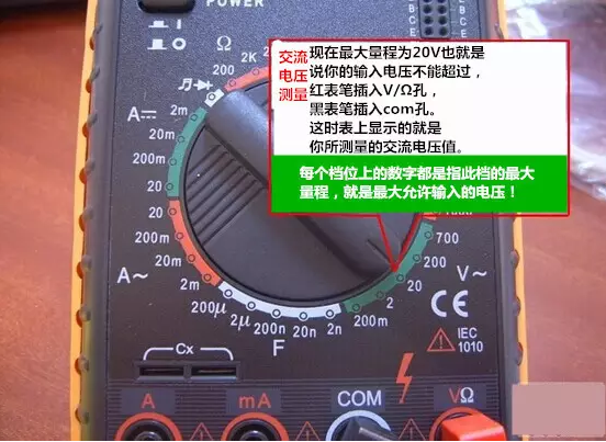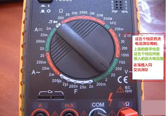2、功能旋轉開關打至V~(交流),V-(直流),并選擇合適的量程 。