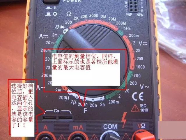 2、將功能旋轉開關打至電容(C)測量檔,并選擇合適的量程。