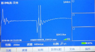 根據測試情況選擇黃地打壓,升高電壓至20KV時擊穿放電,用脈沖電流測得故障位置在144米左右。距離對端比較近。